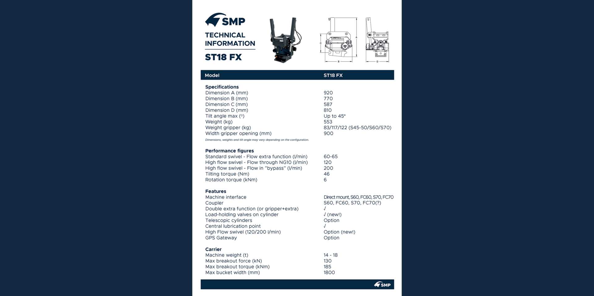 The ST18 FX is designed for excavators weighing between 14 and 18 tons. SMP’s tiltrotators are engineered for uncompromised durability, combining a robust build with a lightweight design that maximizes efficiency and maneuverability. With endless 360° rotation and Tilt angle up to 45°, each unit is equipped with a high standard of features, providing exceptional flexibility and precision for even the most demanding tasks.
